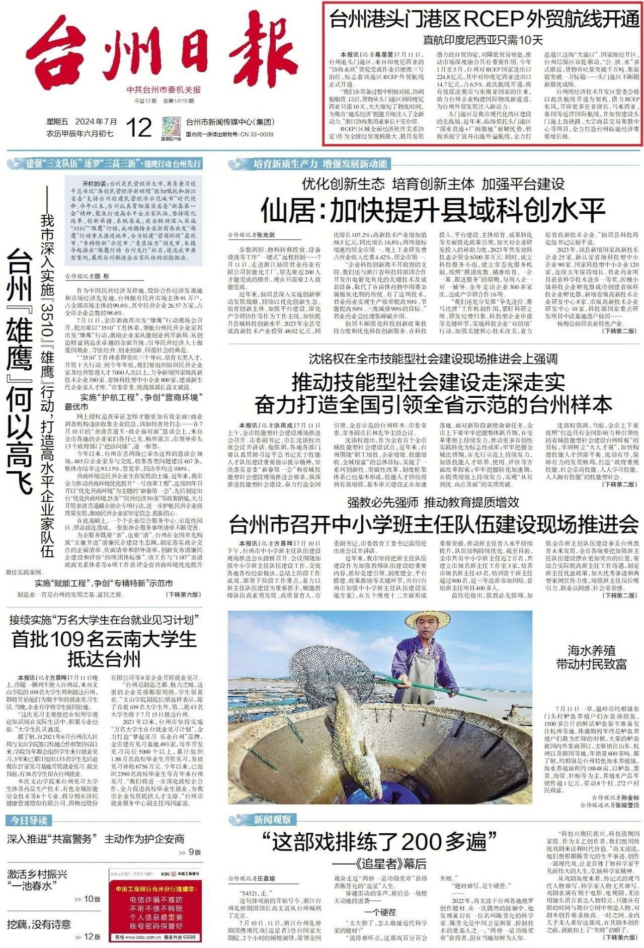RCEP(区域全面经济伙伴关系协定)作为全球经贸规模最大、最具发展潜力的自贸协定,对降低贸易壁垒,推动市场深度融合具有重要作用。今年1至5月,台州对RCEP国家进出口224.8亿元,其中对印度尼西亚进出口14.7亿元,占6.5%。此次航线开通,将有效促进我市与东南亚国家的往来,助力台州企业构建国际物流新通道,为台州外贸发展注入新动力。