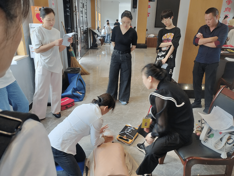 此次活动将理论讲解和实际操作相结合,指导老师围绕应急救护相关内容进行科普讲解,通过分享日常案例,从救援的“黄金6分钟”切入,深入浅出的讲解了心肺复苏应急操作、自动体外除颤仪使用方法以及应急救护的相关常识,加深了村民对急救重要性的认识和相关知识技能的理解掌握。在现场实操环节,工作人员借助“人体”模型,现场演示了心肺复苏和自动体外除颤仪的操作要领进行讲解和示范。大家踊跃参与,轮番上阵,在工作人员手把手指导下进行现场演练。