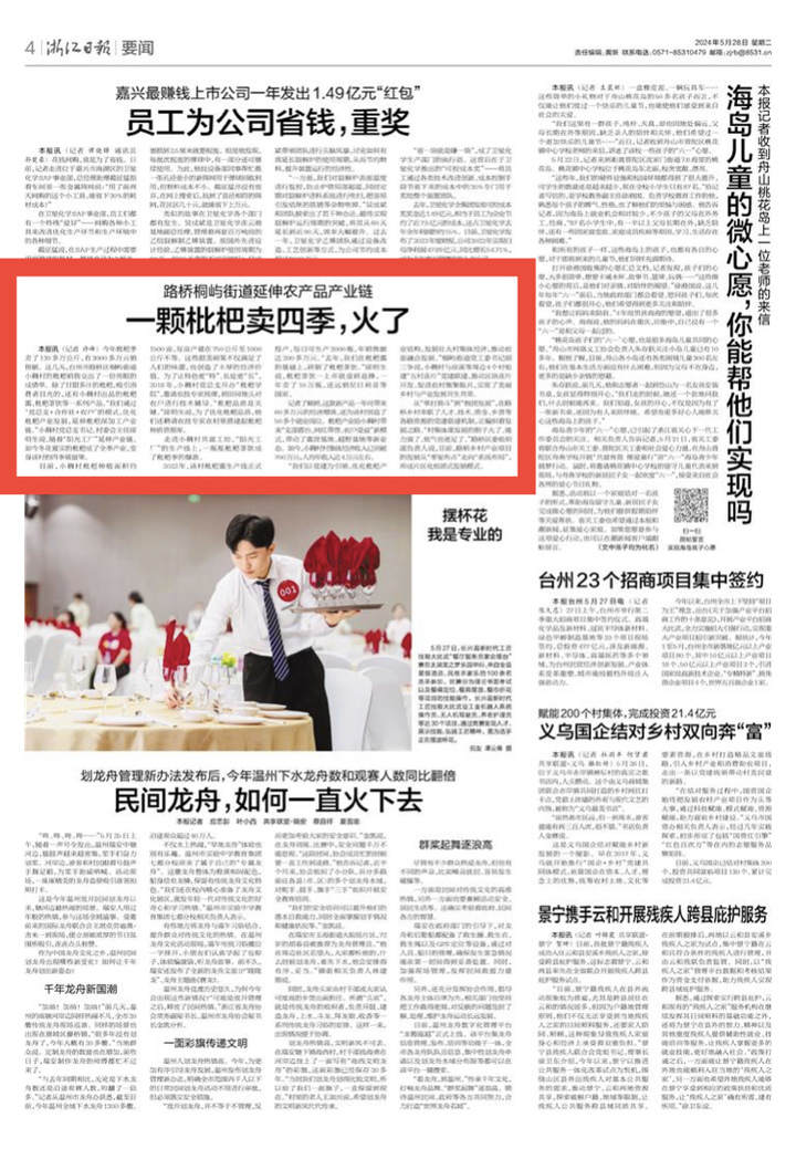 今年枇杷季卖了130多万公斤,有3000多万元销售额。这几天,台州市路桥区桐屿街道小稠村的枇杷销售交出了一份亮眼的成绩单。除了甘甜多汁的枇杷,吸引消费者目光的,还有小稠村出品的枇杷露、枇杷茶饮等一系列产品。“我们通过‘党总支+合作社+农户’的模式,优化枇杷产业发展,延伸枇杷深加工产业链。”小稠村党总支书记、村委会主任邱明生说,随着“阳光工厂”延伸产业链,如今冬花夏实的枇杷成了全季产业,变身该村的四季致富果。