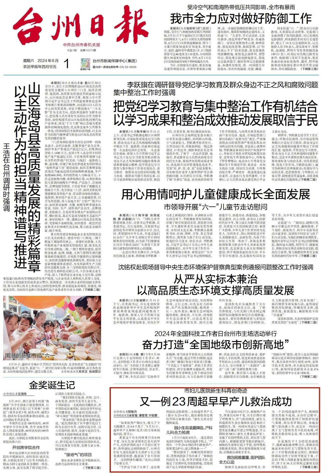 看着这个出生时体重只有0.59千克、身长仅20多厘米巴掌大的早产儿,经医护团队近5个月的日夜守护,各项指标达到同龄孩子,台州市妇女儿童医院新生儿科护士长吕俊英感到很欣慰,抱着孩子舍不得放手。一旁的同事打趣道:“比自己的孩子还要宝贝。”