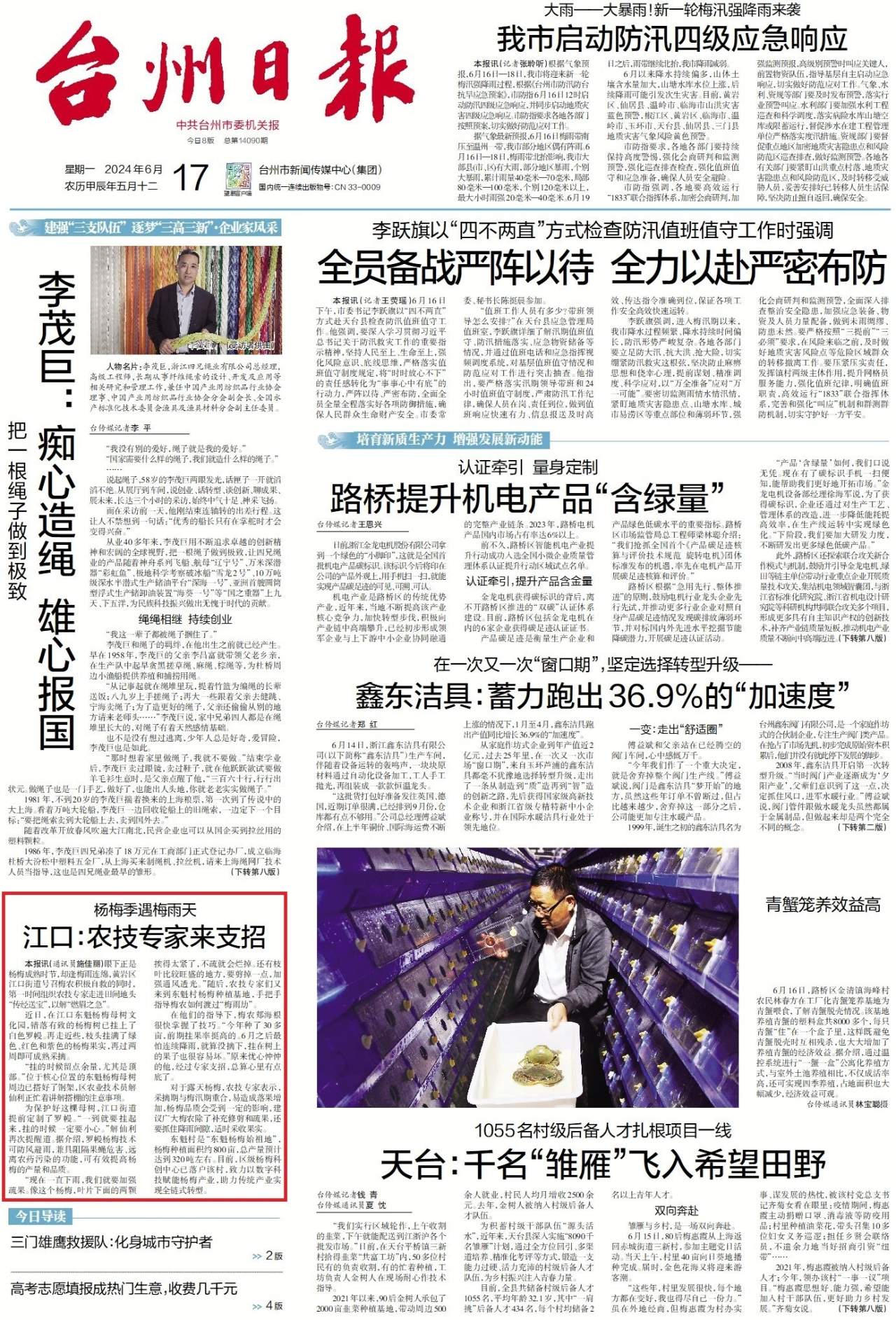 “现在一直下雨,我们就要加强疏果。像这个杨梅,叶片下面的两颗挨得太紧了,不疏就会烂掉。还有枝叶比较旺盛的地方,要剪掉一点,加强通风透光。”随后,农技专家们又来到东魁村杨梅种植基地,手把手指导梅农如何渡过“梅雨劫”。