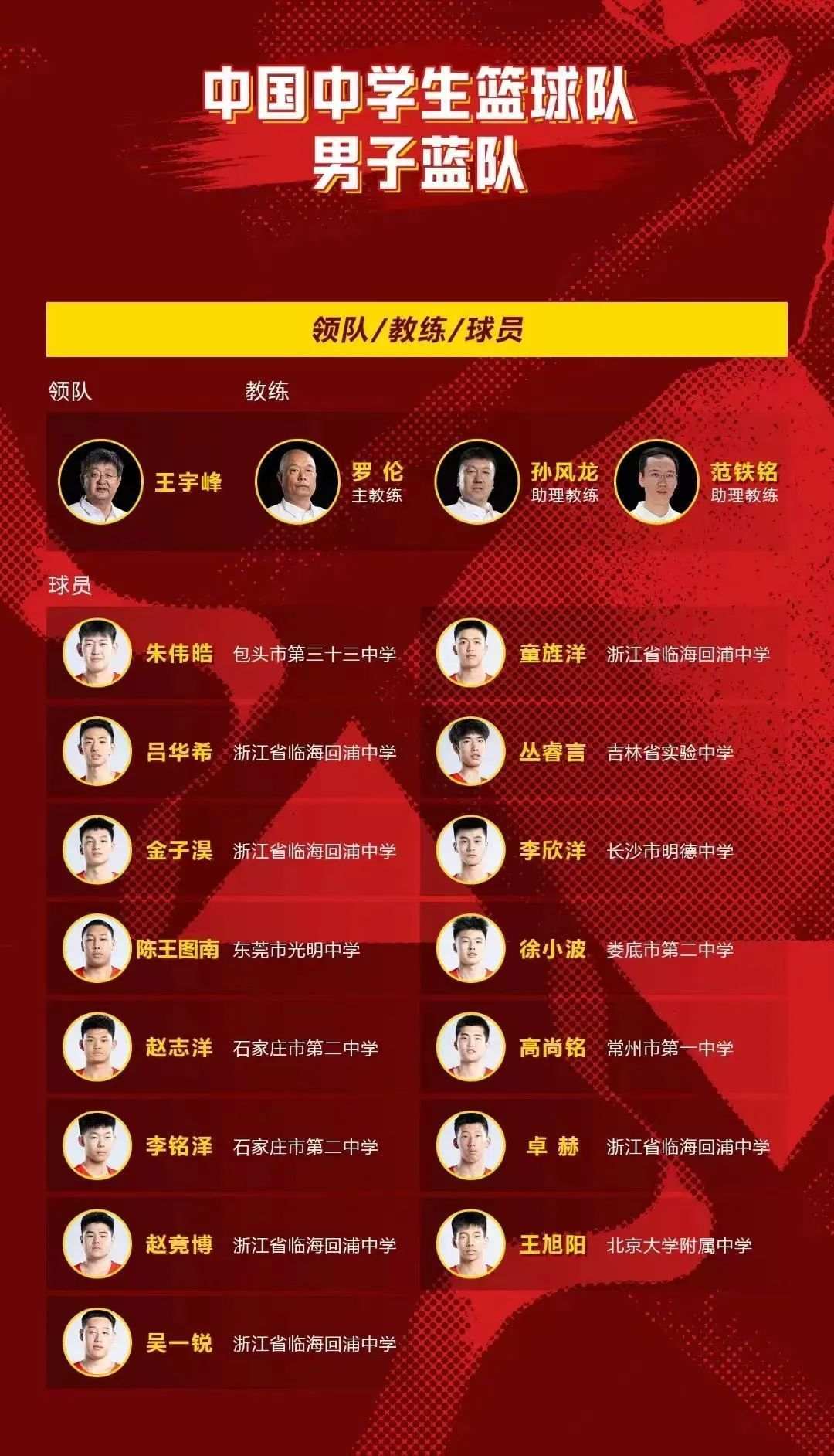 本次世界中学生篮球锦标赛,中国男、女队分别派出蓝(一队)、红(二队)两支队伍参赛。其中,男子一队由浙江临海市回浦中学男篮教练罗伦担任主教练,回浦中学男篮赵竞博、金子淏、童旌洋、吕华希、吴一锐、卓赫六人入选。
