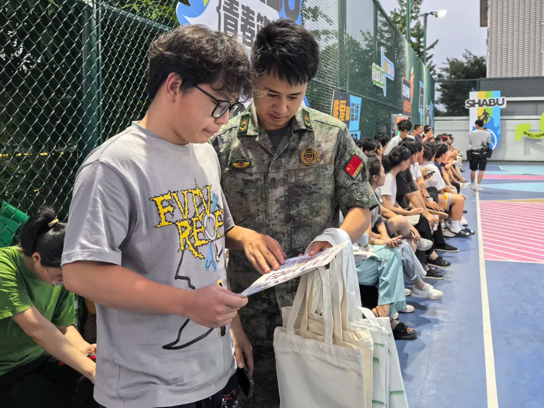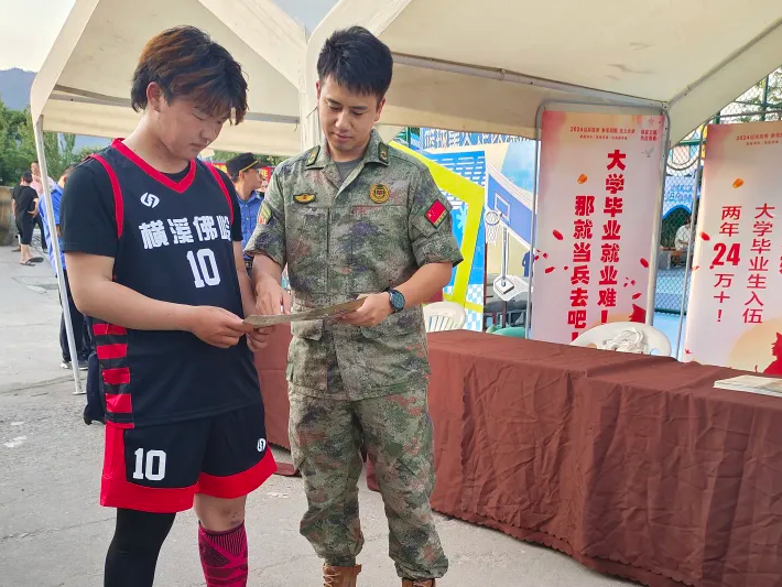 夏日的傍晚,微风轻拂,黄岩沙埠镇篮球场内人声鼎沸,一场别开生面的“村BA”篮球比赛正火热进行。场上球员们挥汗如雨,场下观众欢呼声此起彼伏,其中不乏众多青少年的身影。借此良机,沙埠镇武装部精心策划了一场别开生面的征兵宣传活动,将爱国热情与体育精神巧妙融合。
