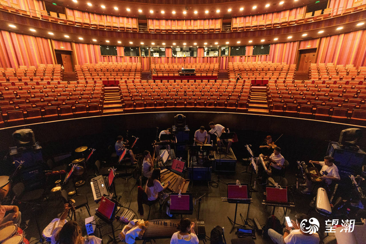 乐池内,乐队成员依次调试声音,确保演出时的音质和音量达到最佳状态。乐队队长汤晓威说:“我们整个乐队是服务演员的,每个人的乐器完成试音后,还要对一下乐谱。”