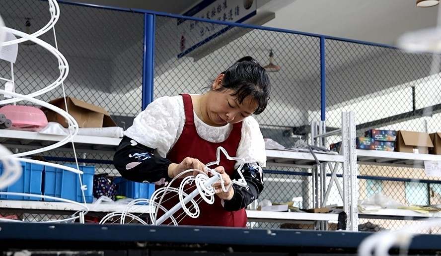 在浙江长烁灯饰照明有限公司,工人们正在赶制一批发往澳大利亚的圣诞节灯饰订单,包括圣诞树、麋鹿、圣诞礼盒等户外庭院造型灯,共12款产品,计划在七月底前发货。